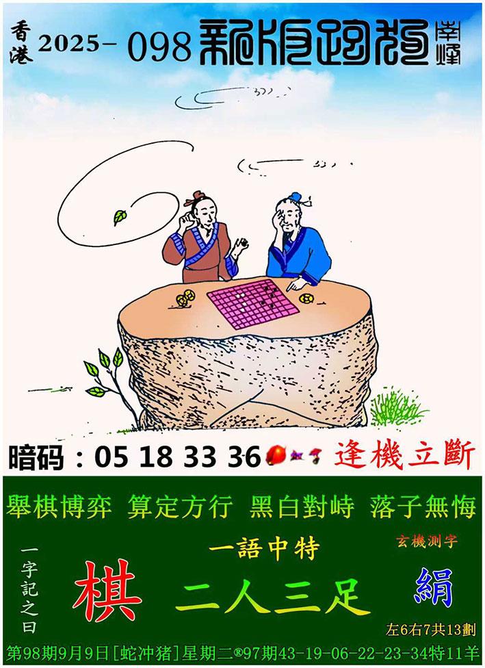098期新版跑狗一字記之曰:【棋】 玄機測字:《絹》 一語中特:二人三足