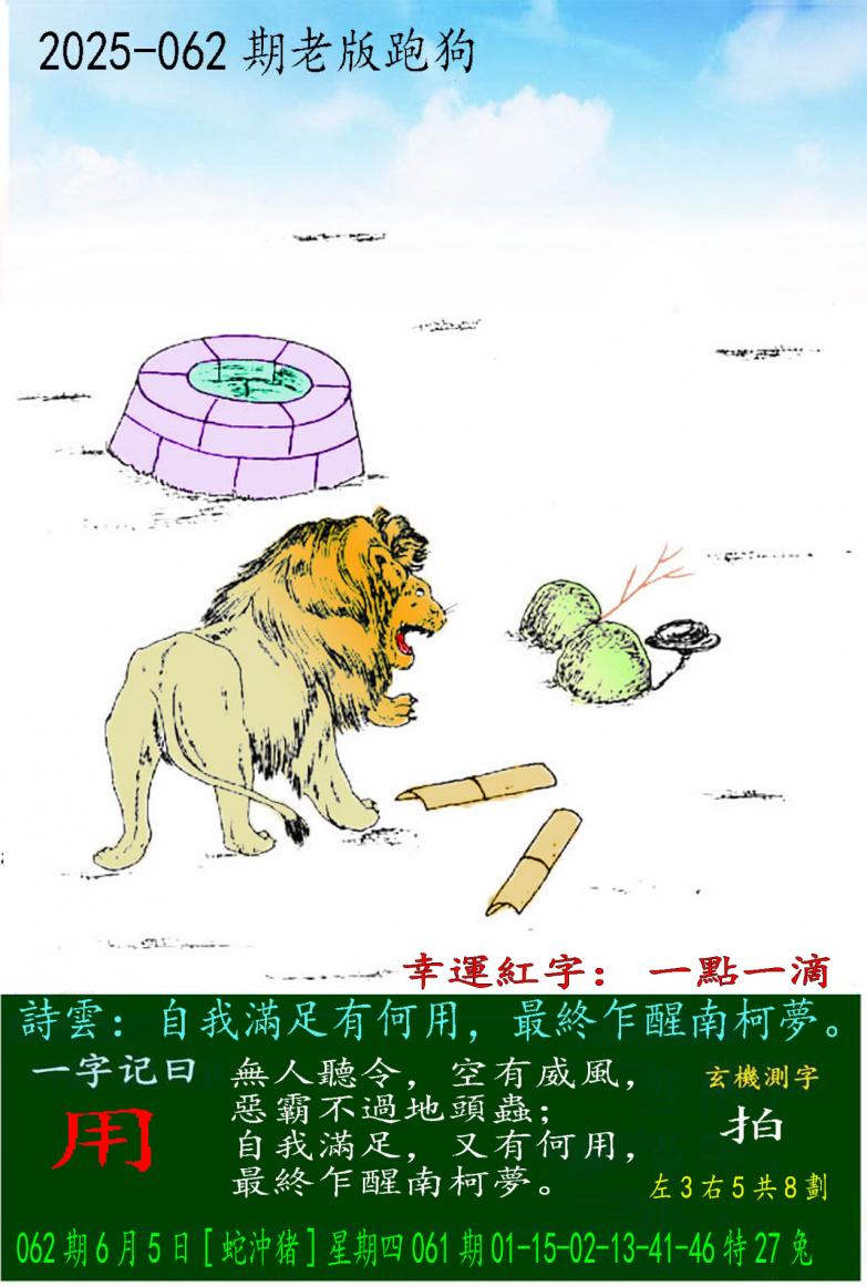 062期老版跑狗一字記之曰:【用】 詩雲:自我滿足有何用,最終乍醒南柯夢。