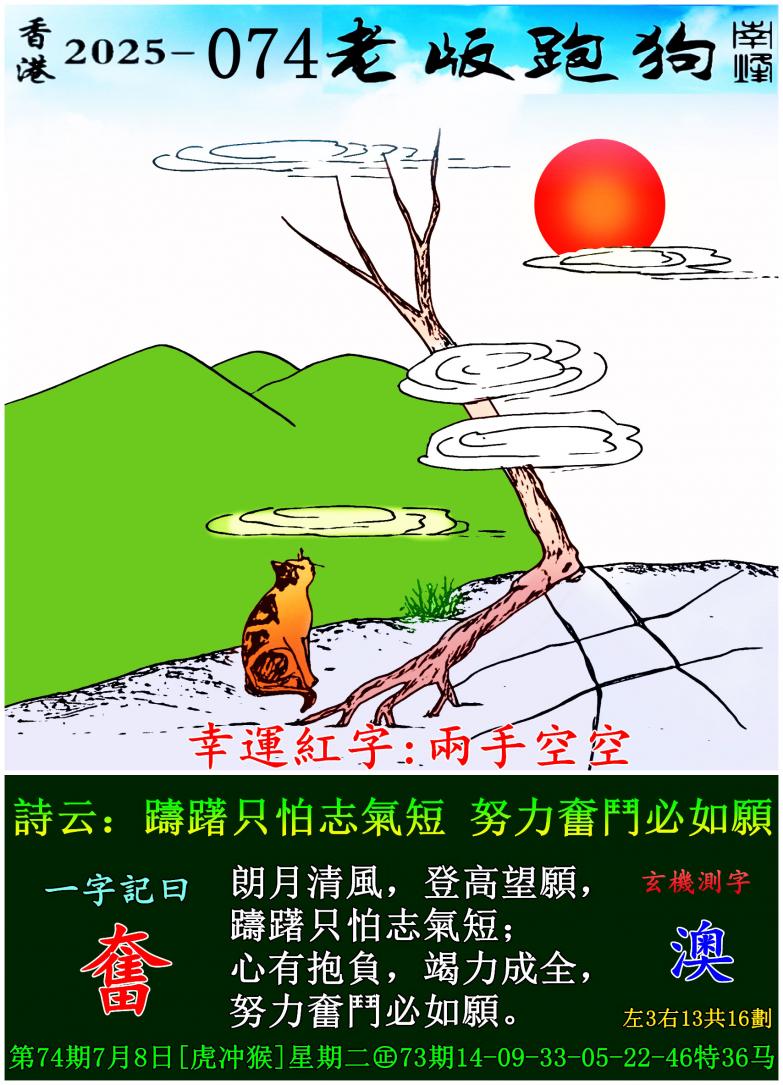 074期老版跑狗一字記之曰:【奮】 詩雲:躊躇只怕志氣短,努力奮鬥必如願。