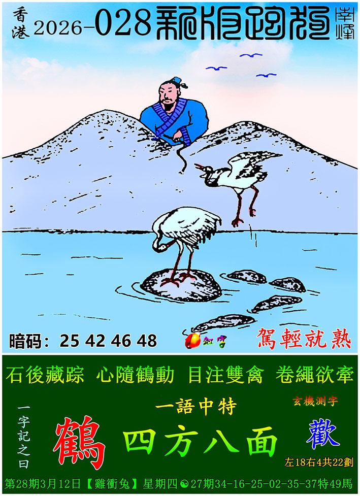 028期新版跑狗一字記之曰:【鶴】 玄機測字:《歡》 一語中特:四方八面
