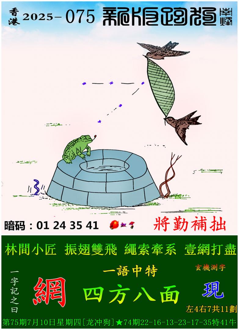 075期新版跑狗一字記之曰:【網】 玄機測字:《現》 一語中特:四方八面