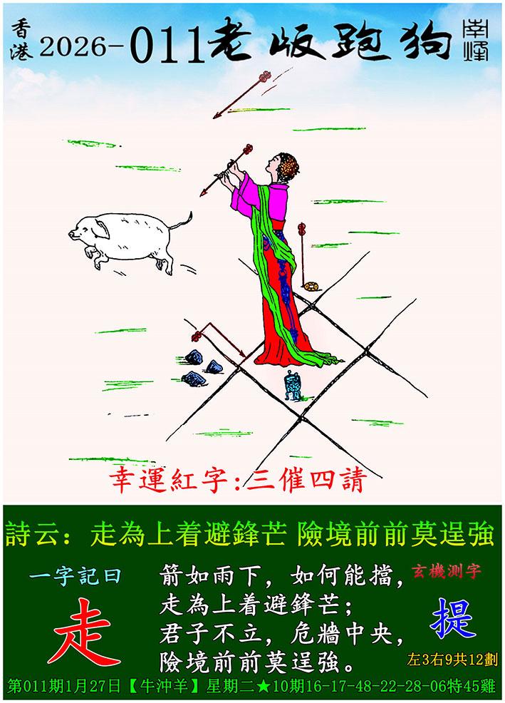 011期老版跑狗一字記之曰:【走】 詩雲:走為上着避鋒芒,險境前前莫逞強。