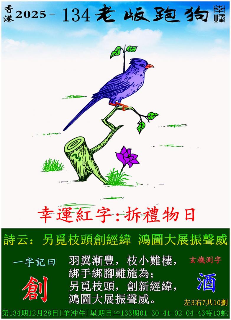 134期老版跑狗一字記之曰:【創】 詩雲:另覓枝頭創經緯,鴻圖大展振聲威。