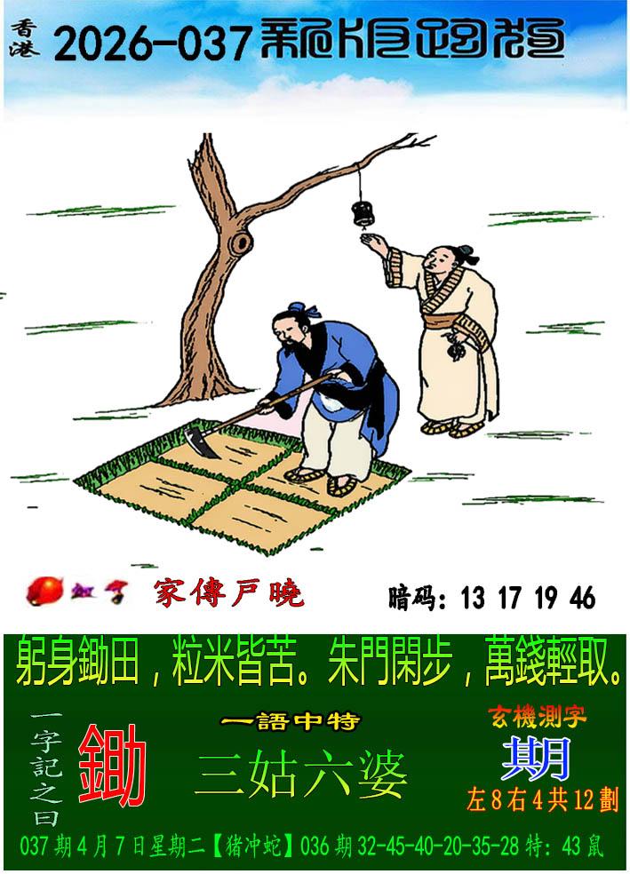 037期新版跑狗一字記之曰:【鋤】 玄機測字:《期》 一語中特:三姑六婆