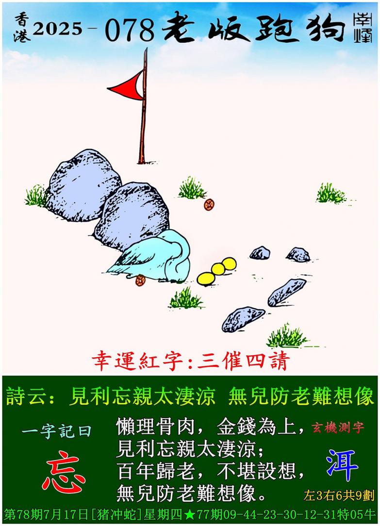 078期老版跑狗一字記之曰:【忘】 詩雲:見利忘親太淒涼,無兒防老難想像。