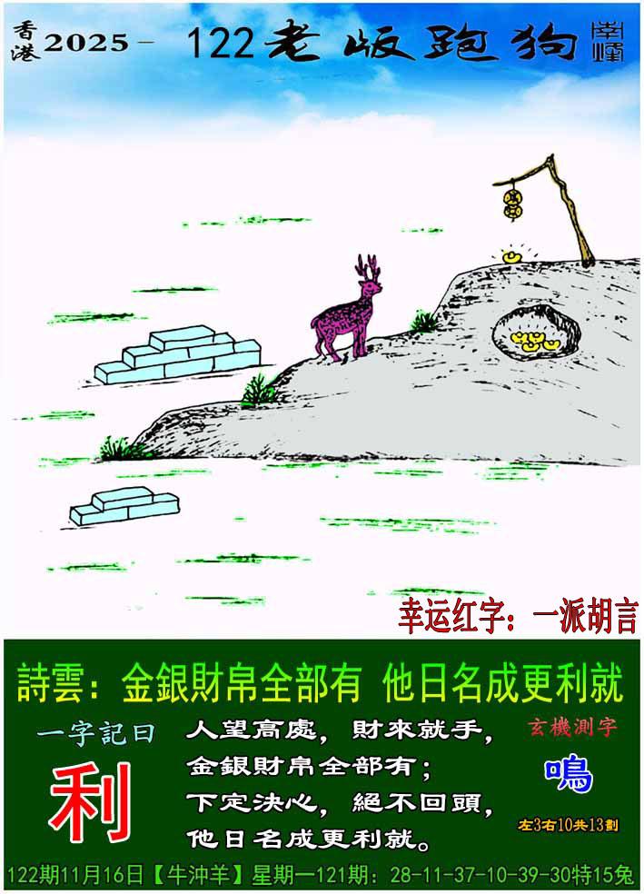 122期老版跑狗一字記之曰:【利】 詩雲:金銀財帛全部有,他日名成更利就。