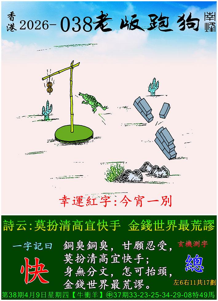 038期老版跑狗一字記之曰:【快】 詩雲:莫扮清高宜快手,金錢世界最荒謬。